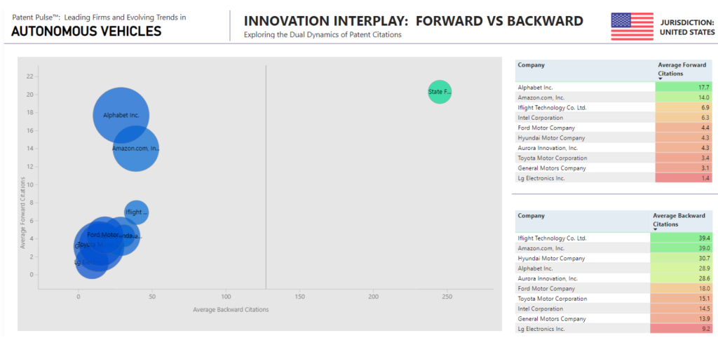 - Microsoft and Alphabet have a high average of forward citations and multiple unique CPC codes.